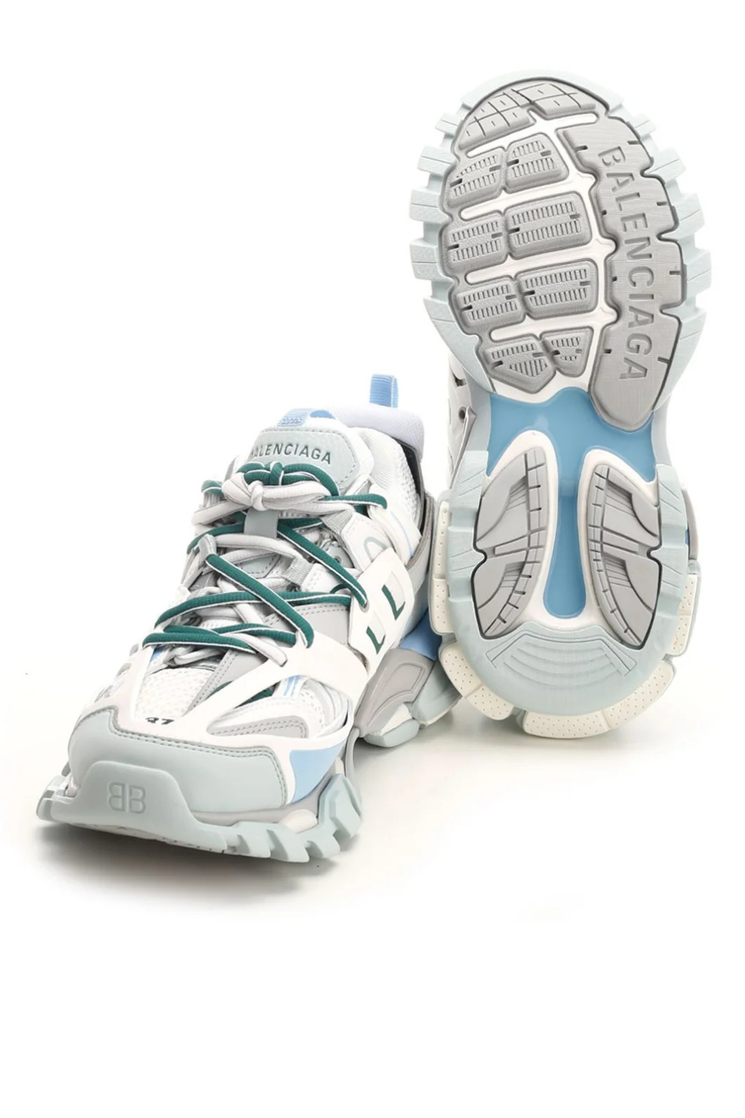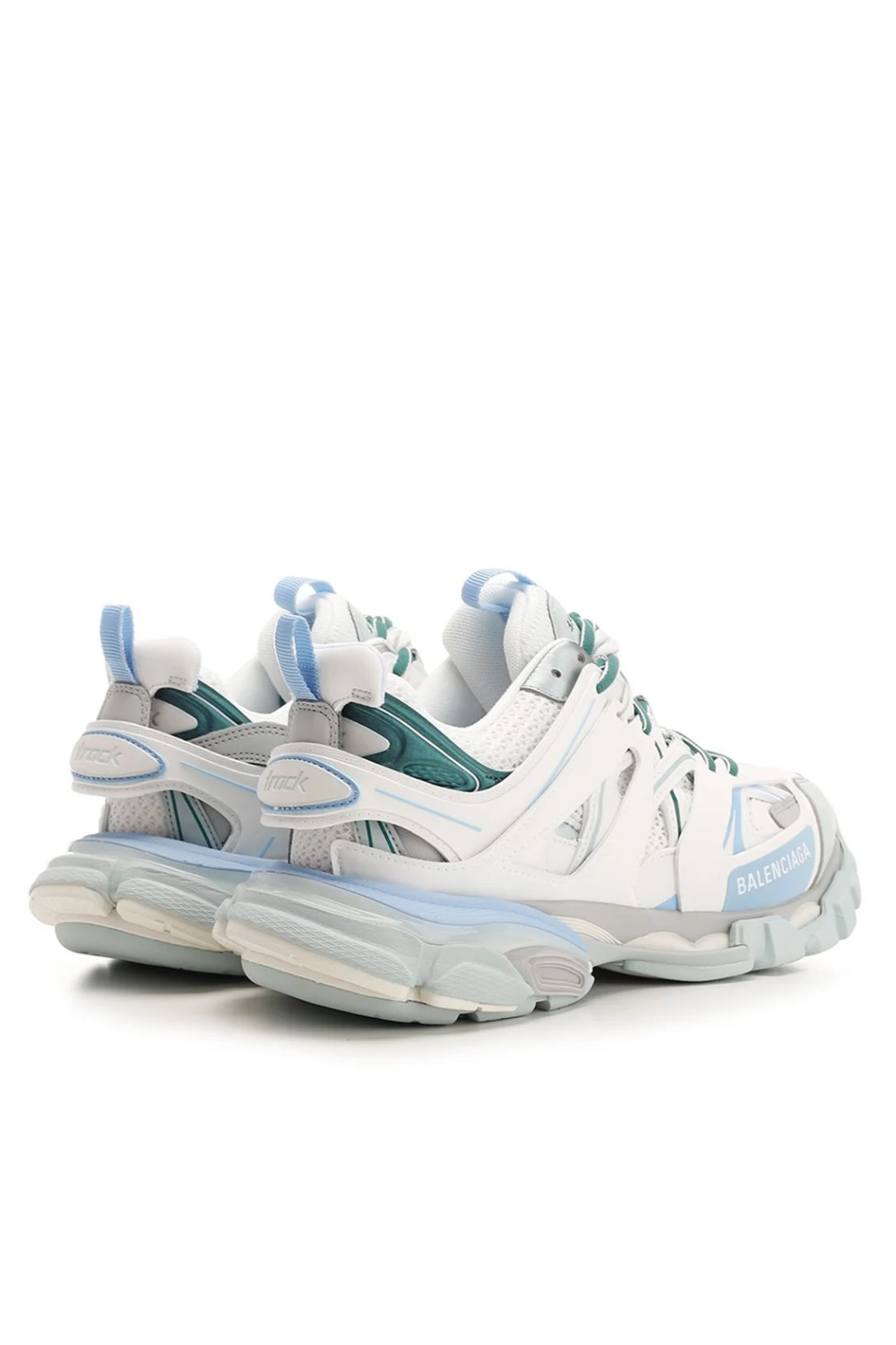 Modelul se remarcă printr-un mix chromatic vibrant de alb, gri, verde și albastru, într-o jestetică sportivă futuristă. Silueta chunky, devenită emblematică pentru Balenciaga, este completată de un system de închidere cu șireturi inspirat din încălțămintea de trail, alături de panouri suprapuse ce oferă un look architectural. Brandingul discret întărește identitatea modelului, fără a domina designul complex.